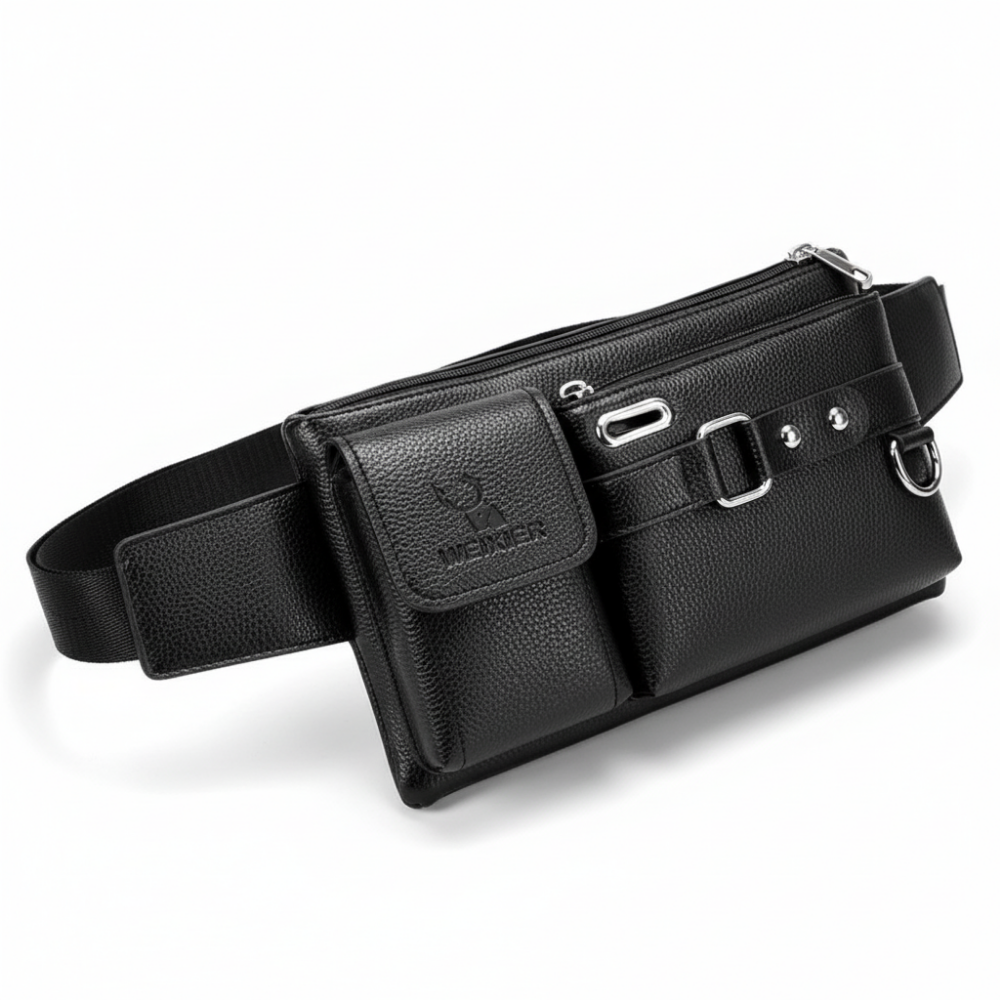 The ultimate hands-free experience. This sleek black utility bag features a minimalist design with multiple secure pouches for your phone, wallet, and keys.